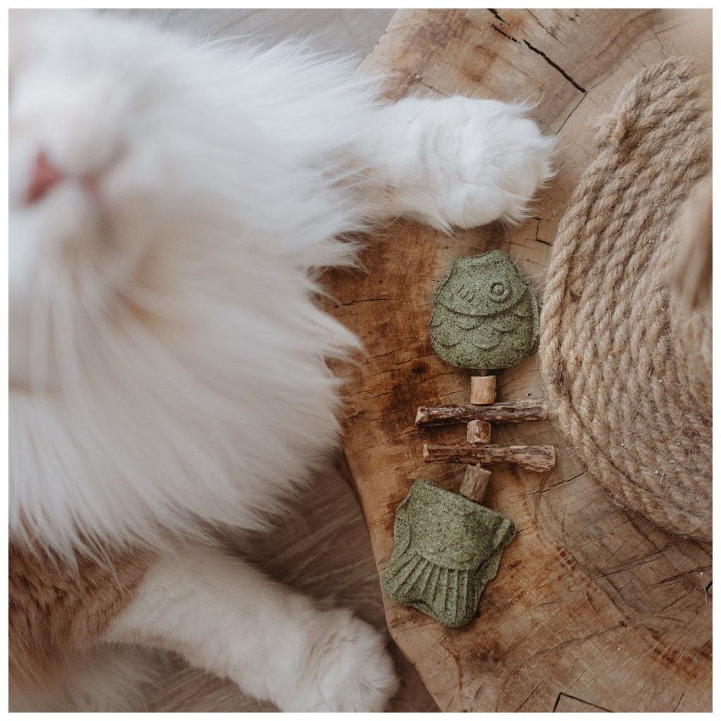 Tato ohebná hračka ve tvaru rybičky je naplněna kombinací šanty kočičí a dřívek matatabi – dvou bylin, které kočky naprosto milují. Šanta kočičí (nepeta cataria) stimuluje kočičí mozek, navozuje pocit radosti, hravosti a uvolnění. Matatabi (také známé jako silvervine) má ještě silnější účinky než šanta – probouzí zájem i u těch koček, které na šantu nereagují.