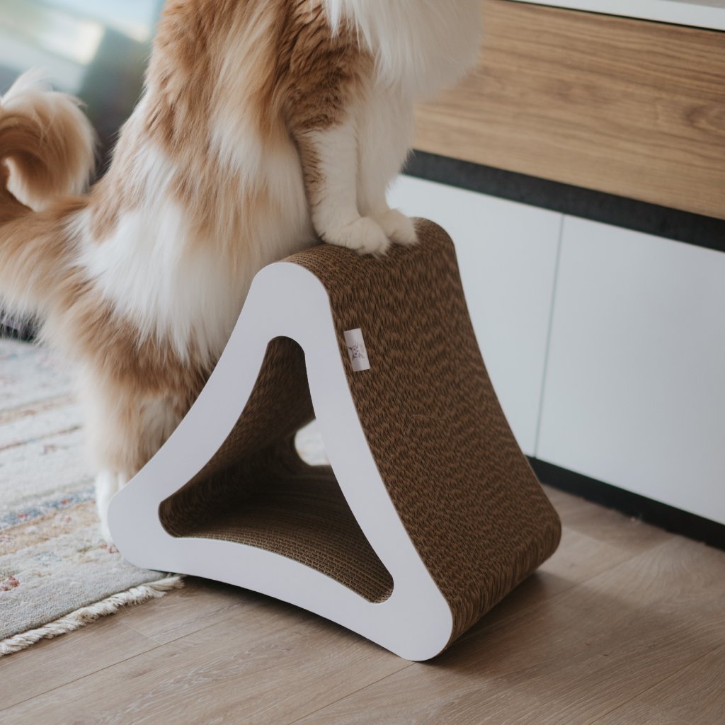 Vyrobeno ze 100% recyklovatelného, pevného kartonu – šetrné k přírodě a odolné vůči kočičím náletům.