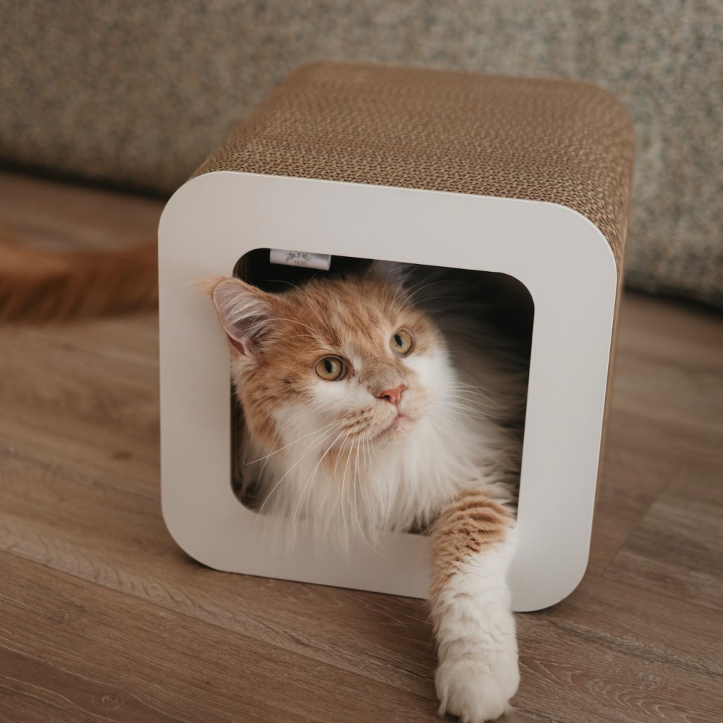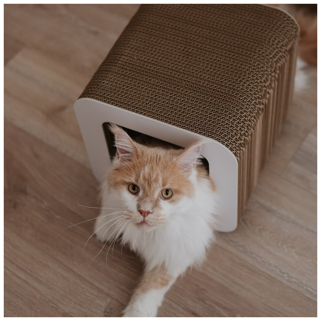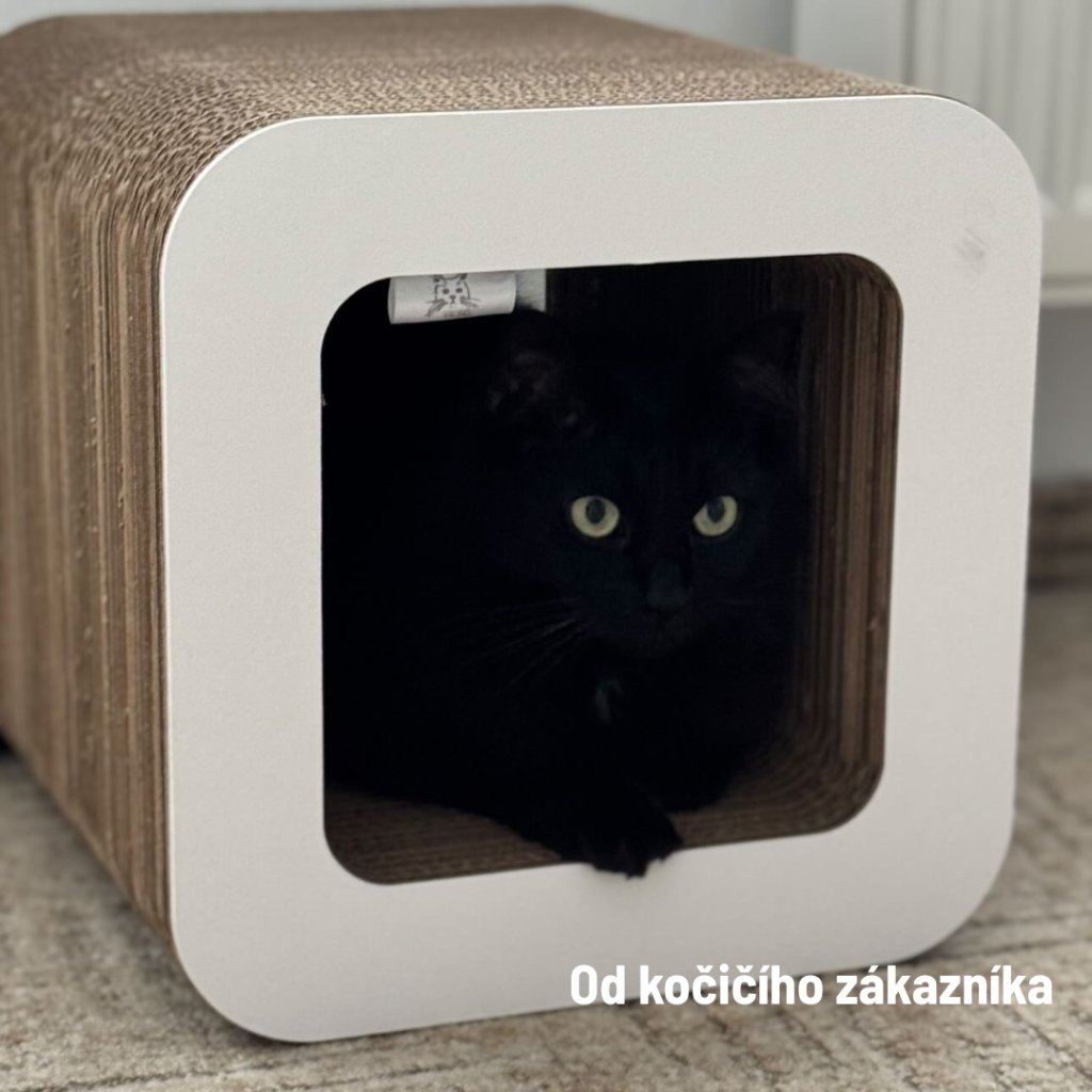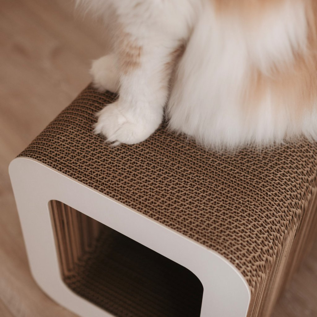 Karton přitahuje kočky svou texturou a vůní, ideální pro škrábání a odpočinek.
