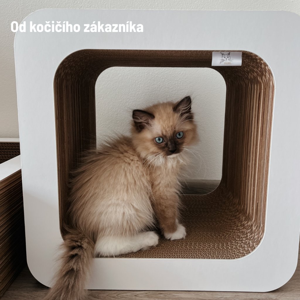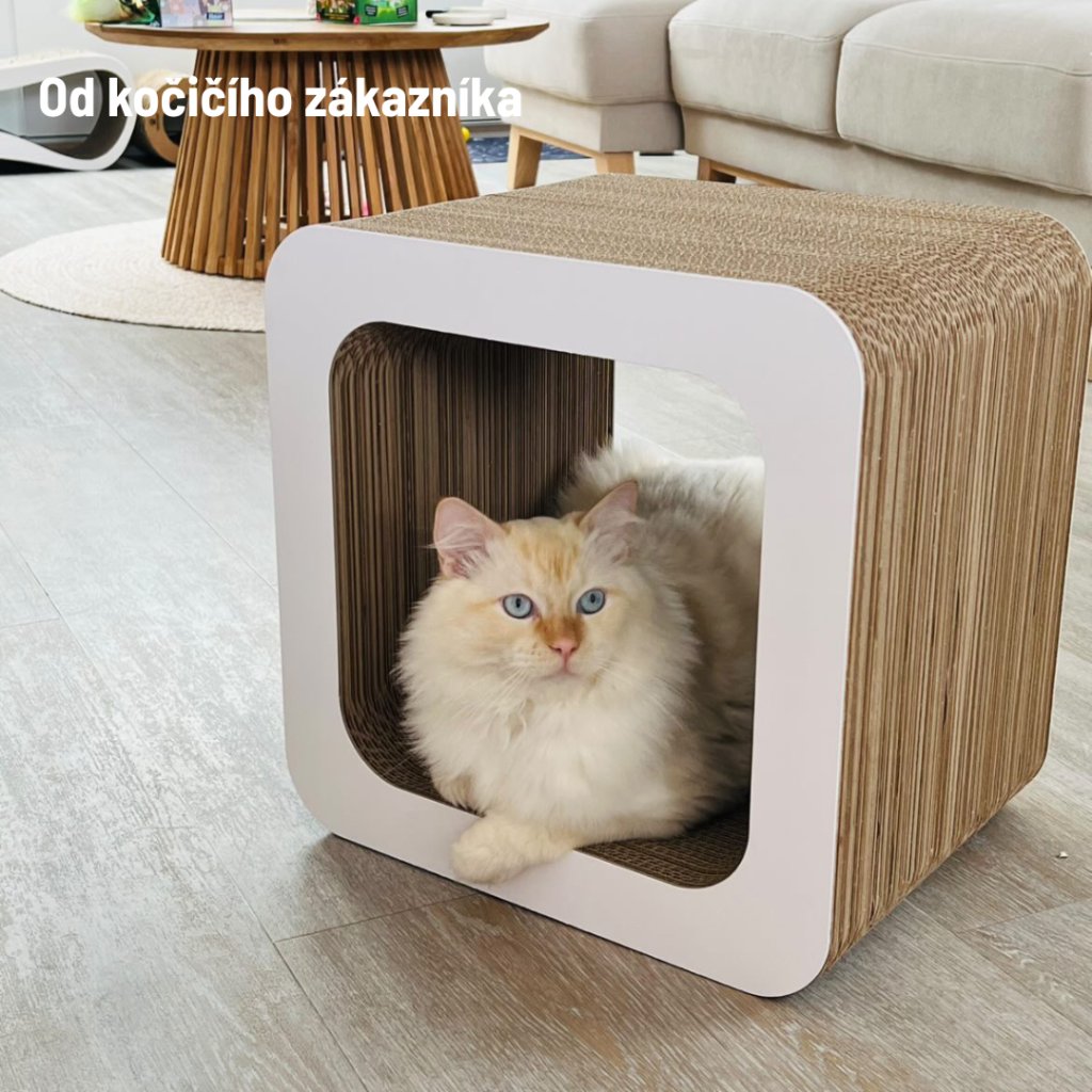 Karton přitahuje kočky svou texturou a vůní, ideální pro škrábání a odpočinek.